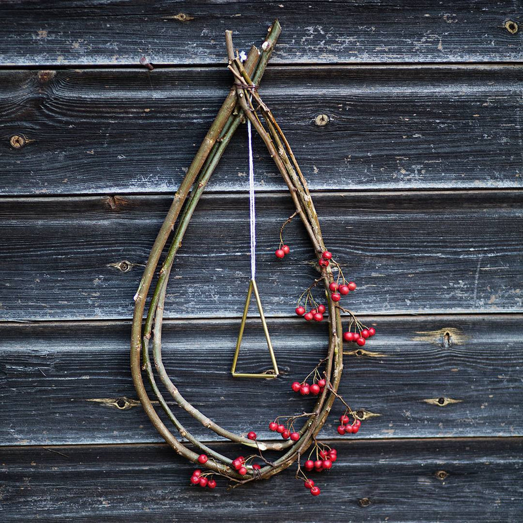 This wreath relies on the unique branches it’s crafted from to hold in the soft green mosses and berry sprays.